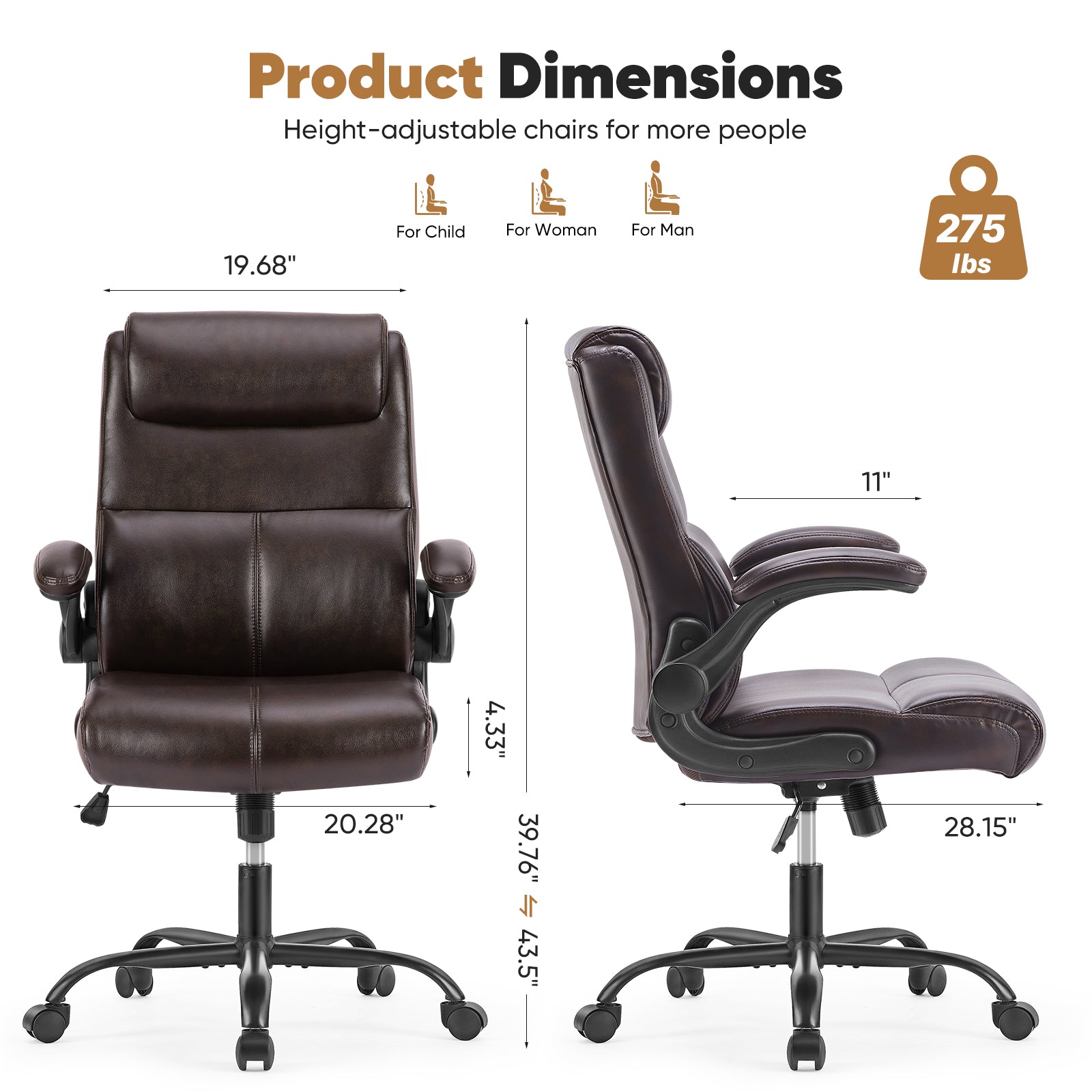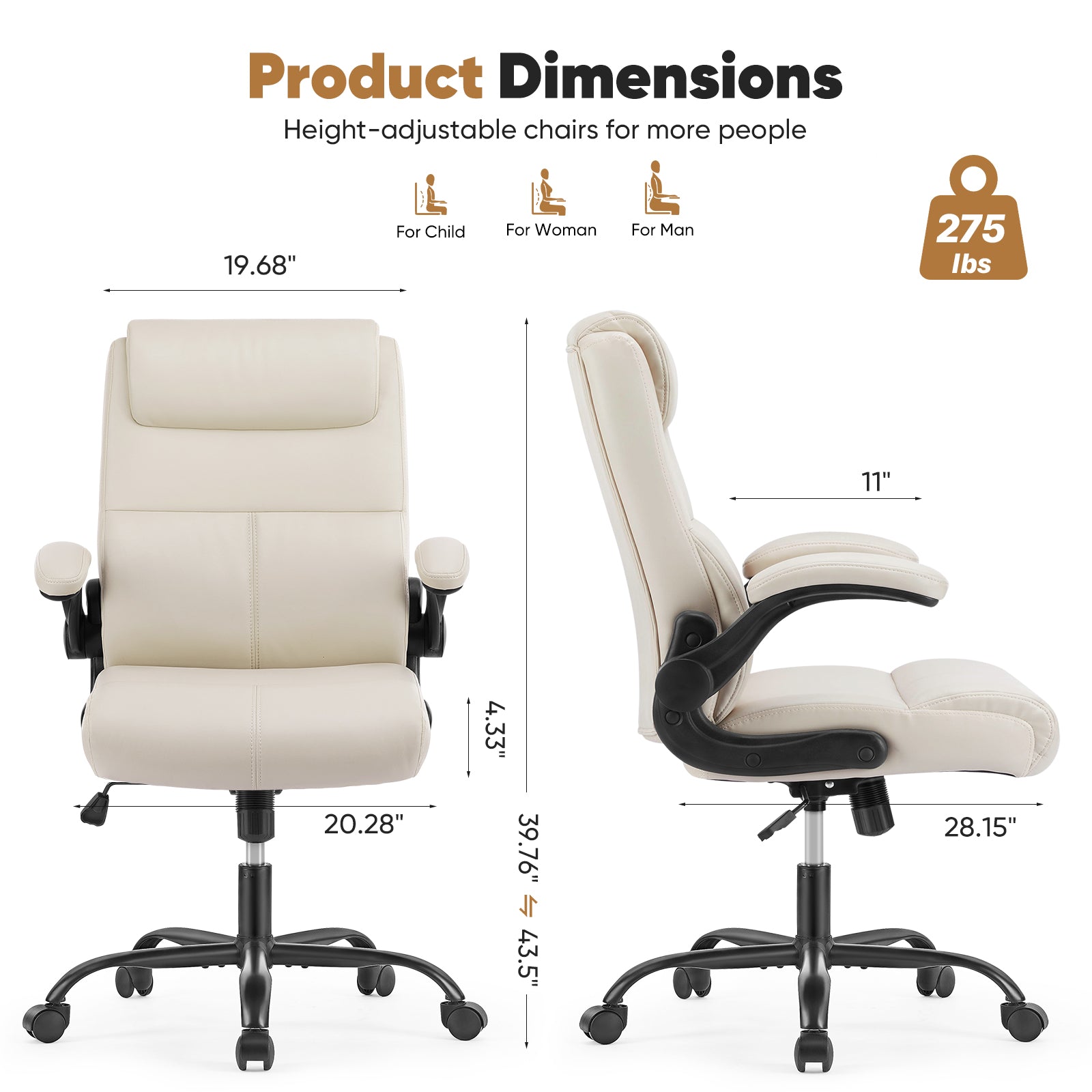 - Ergonomic Design - This home office chair has a wide and comfortable design with a seat cushion width of 20.08, an adjustable seat height between 18.7 and 22.44, armrest length of 10.63. In addition, the adjustable features and soft padding effectively relieve your stress and ensure a healthy sitting posture.