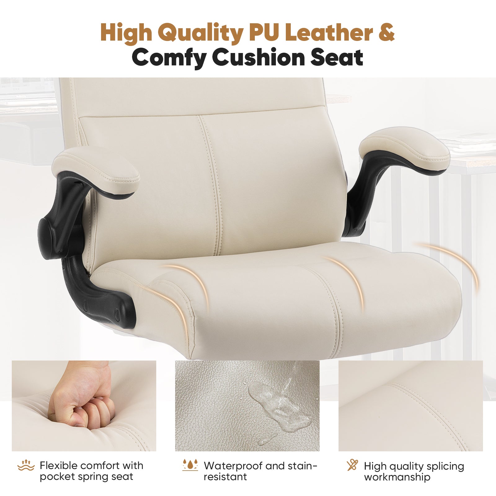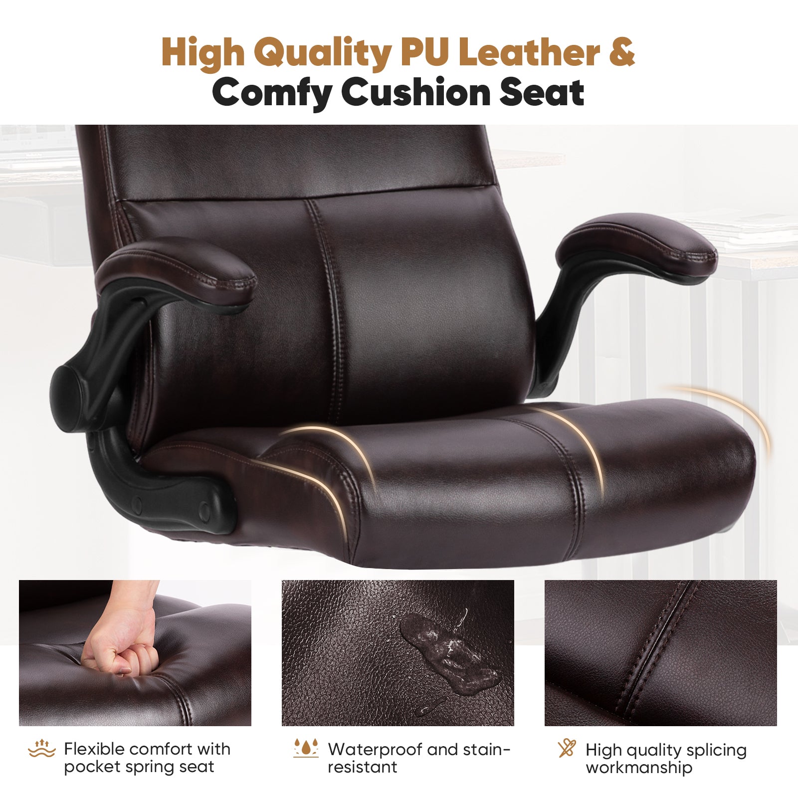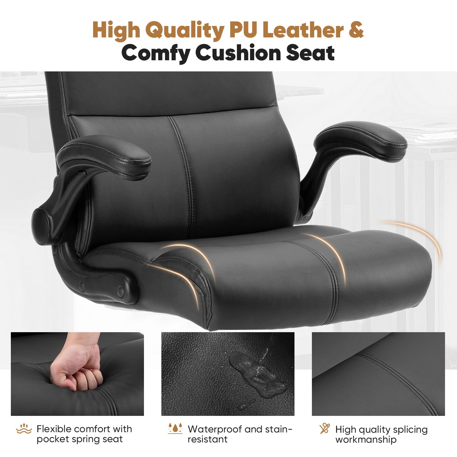 - Comfortable Material - The backrest and cushion of this executive office chair are made of high-density foam cushion, which is not only comfortable but also upholstered. The exterior of the desk chair is covered by UP Leather, and the overall simplicity of the computer chair is atmospheric and easy to clean.