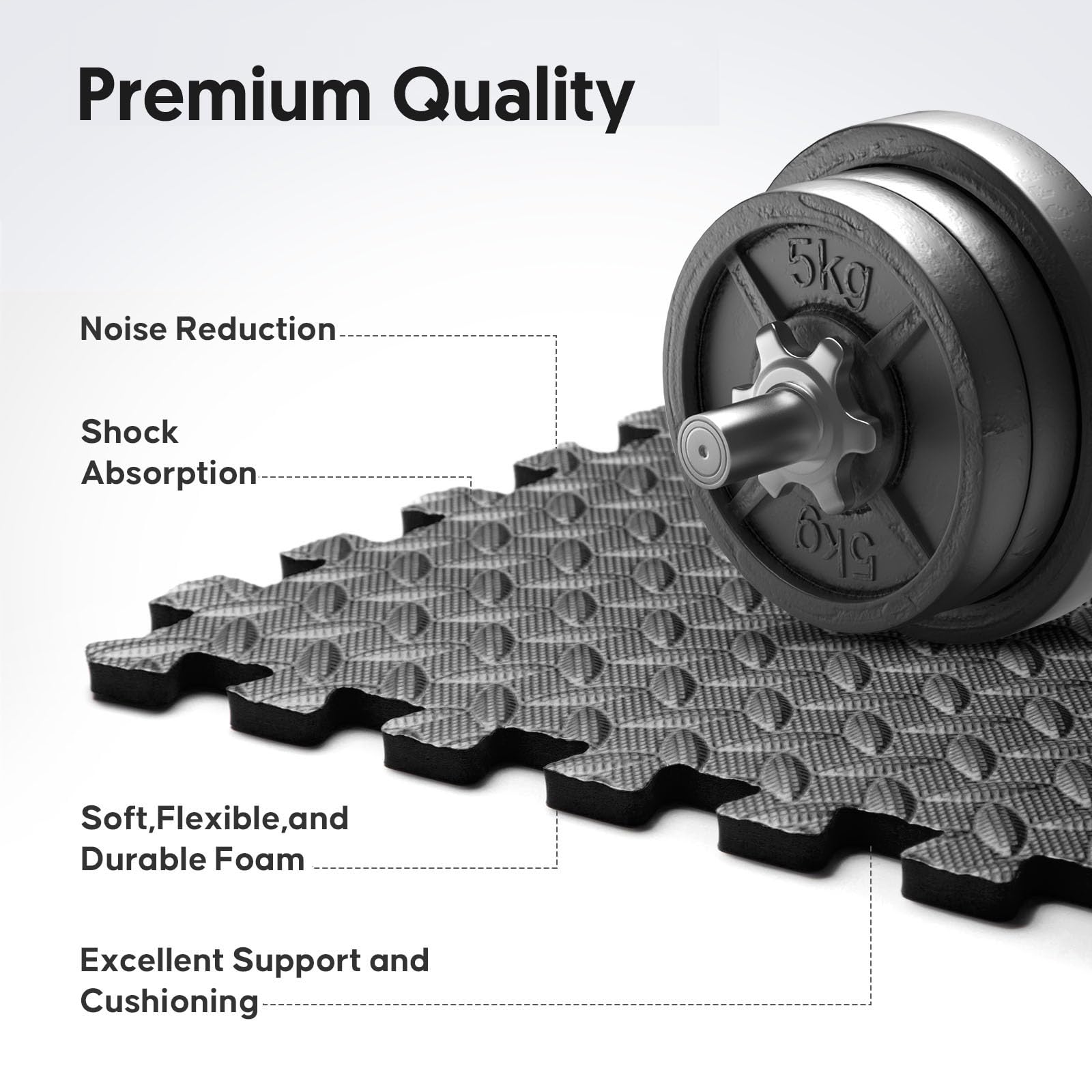 Transform any space into a functional workout area with our 24 inch EVA Foam Tiles, featuring 12 interlocking puzzle pieces that create a thick, durable exercise mat. Designed for home gyms, these padded exercise mats offer superior cushioning with 0.56 inches of thickness, ensuring comfort for squats and other exercises. Crafted from high-quality EVA foam, the mats are chew-proof and resilient, providing excellent rubber protection for basement floors or any area requiring heavy-duty flooring. With 24 square feet of coverage, the interlocking design allows you to customize the mat configuration to suit your space, making it ideal for whole floor equipment setups or specific areas like under a treadmill. The water-resistant and soundproof properties make these mats perfect for apartments, garages, and even outdoor settings, doubling as an alfombra flotante for outdoor play or an ice fishing floor mat. These versatile foam tiles are easy to assemble and disassemble, offering convenient storage and portability. Whether used as a gym flooring mat, a play pad for children, or a basement floor protector, these puzzle exercise mats deliver quality and value for daily use. Elevate your home fitness experience with a reliable and multifunctional flooring solution that meets all your exercise needs.